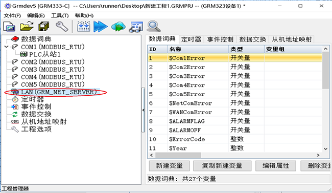 本地读写和该电脑局域网连接的 GRM 设备变量。客户端电脑需安装巨控 GrmLanOpcServer。 客户端电脑通过网线直接连接 GRM 网关(设置和网关网口同一个网段),或者和 GRM 网关通过路由器交换机连接。在 GRMDEV 里面配置 GRM 网口为 GRM_NET-SERVER 协议,并下载到网关即可。
