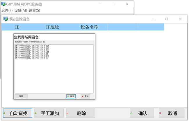 使用巨控 GrmLanOpcServer “设备”菜单“添加删除设备”,可手工输入序号或者自动查找 NET400 网关(有多个网关的的话添加多个)