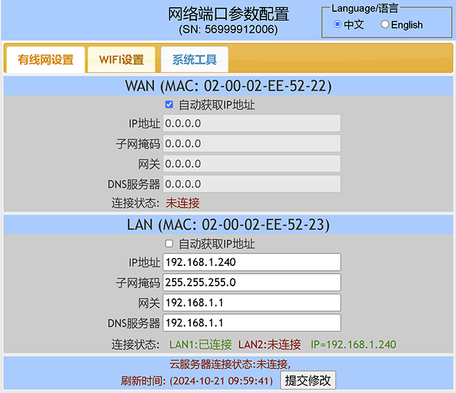 段内,然后在该电脑的 IE 浏览器输入模块的当前 IP 地址,点击“提交修改”,“重启模块”即可修改模块 2个网口的 IP 地址为新的地址。 初次使用可将电脑网线直接连接模块 LAN 口,并将电脑设置为 192.168.1.X 的网段,然后在浏览器输入模块初始 IP 地址(192.168.1.240) 模块的 IP 在浏览器下图里面配置即可(出厂初始IP,LAN 口为 192.168.1.240)