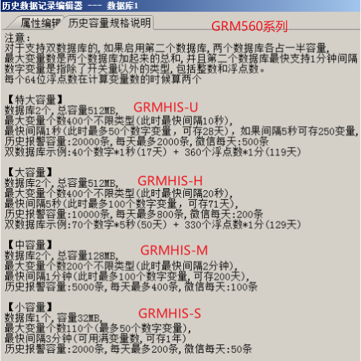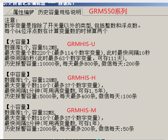 型号:GRMHIS-H大:最快5秒钟变量采集间隔,512M数据容量,可记录1万条历史报警,每天微信推送上限200条 型号:GRMHIS-U超大,特别注意GRMHIS-U这个型号只有GRM560系列模块才能支持:最快1秒钟采集间隔,512M数据容量,可记录2万条历史报警,每天微信推送上限500条 上述费用是一次收费,终身使用,需要2个模块使用,那么购买2个就可以,购买的时候,增加一个型号和数量,型号:GRMHIS-S 或 GRMHIS-M 或 GRMHIS-H,型号区别如上描述