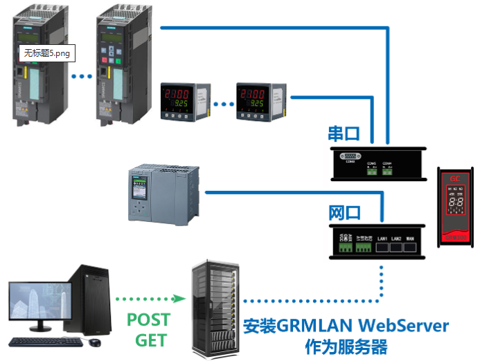 应用难点:上位机不支持MODBUS,采集速度慢,距离长,设备多,现场干扰大 巨控方案:使用GRM300系列网关,最多5个隔离串口并行采集变频器和仪表网关网口接电脑 ,直接转成OPCSERVER协议,WINCC即可获取数据